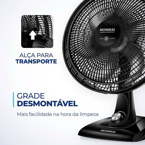 POTENCIA 140 WATTS, 03 VELOC. HELICE 06 PAS – Com 40 cm e 3 velocidades, o Ventilador Mondial Super Power VSP-40-B é vento mais forte. Ele tem baixo nível de ruído, ajuste de altura, sistema oscilante lateral, inclinação vertical regulável, além ser compacto e ter baixo consumo. Sua hélice tem desig